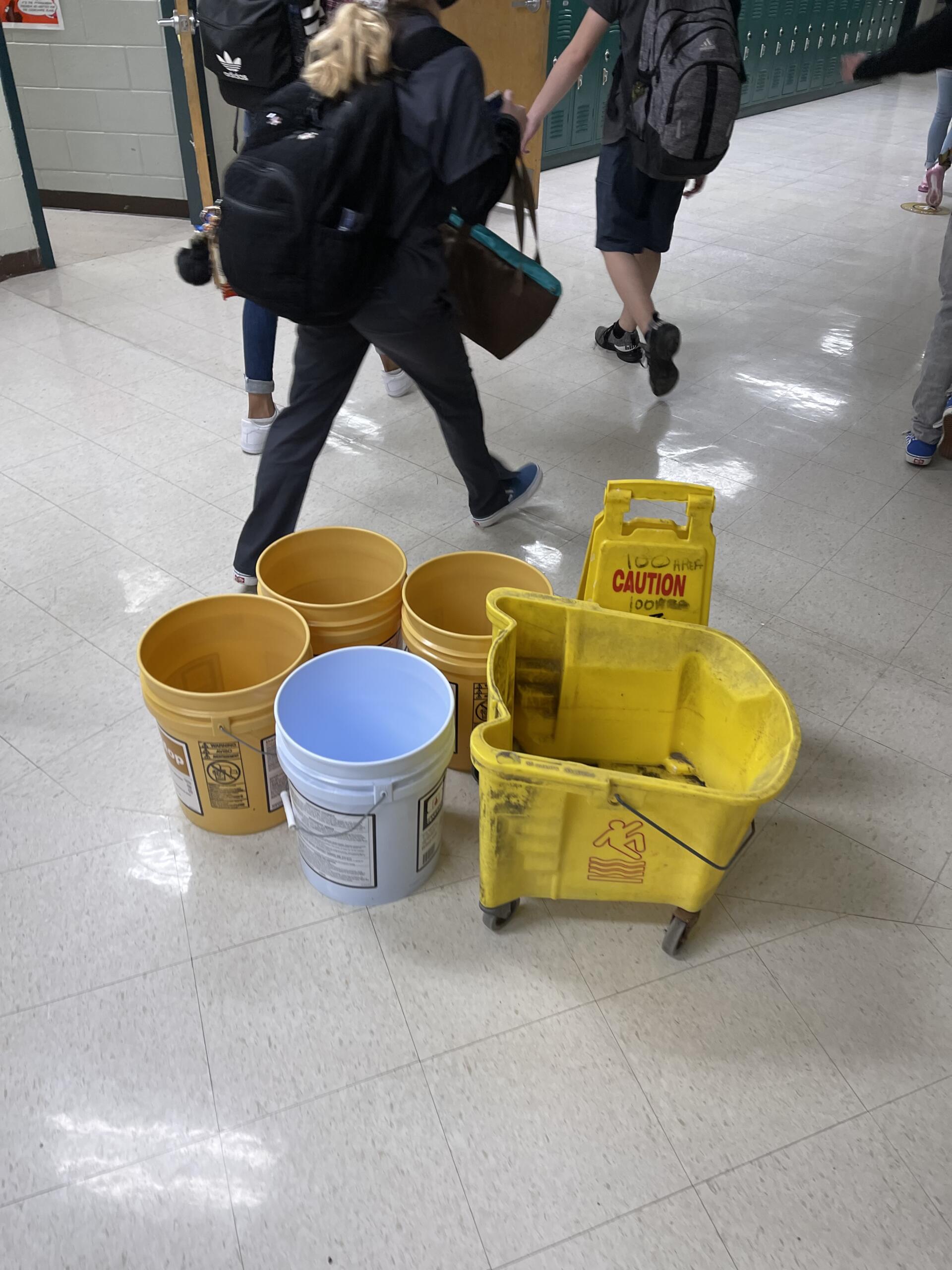 Clarksville Now received images of the water-damaged ceiling at Northwest, with a number of buckets and trash cans being used to catch leaking water.