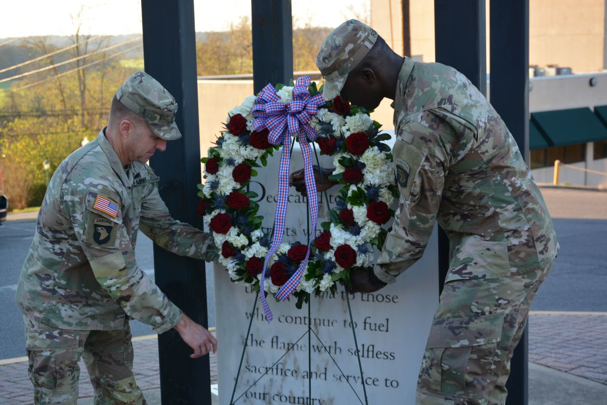 Brig. Gen. John Lubas and Command Sgt. Maj. Amar Fofana, with the 101st Airborne Division from Fort Campbell placed the wreath at the site.
