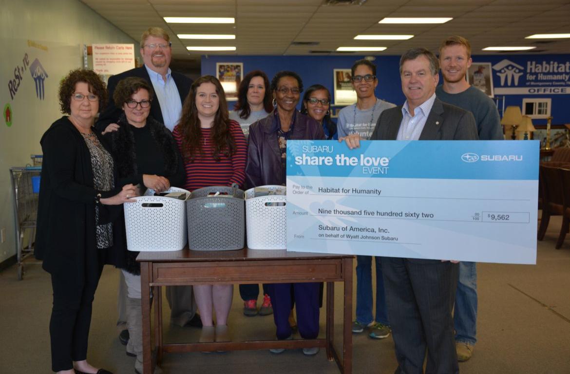 CLARKSVILLE, Tenn. – (CLARKSVILLENOW) As part of the Subaru Share the Love Event, Wyatt Johnson Subaru donated $9,562 to Habitat for Humanity of Montgomery County Friday. Habitat for Humanity works to eliminate poverty housing from Clarksville-Montgomery County and to make decent, affordable housing for all people.