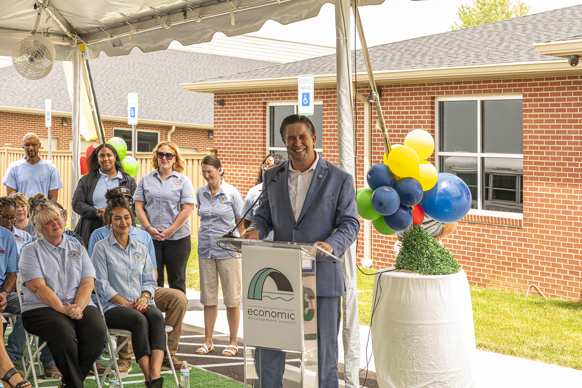 Josh Ward gives the welcoming speech and the speaker introductions at the Youth Academy Industrial Park Childcare Facility ribbon cutting. August 1, 2024 (Jeff Danault)