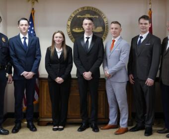 Mayor Joe Pitts and Chief Ty Burdine recently welcomed five new officers to the Clarksville Police Department.