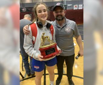 Montgomery Central senior Audrey Levendusky earned her 100th career pin on Saturday at the annual Coyote Classic hosted by West Creek and was also given the Outstanding Wrestler Award after a dominant performance.